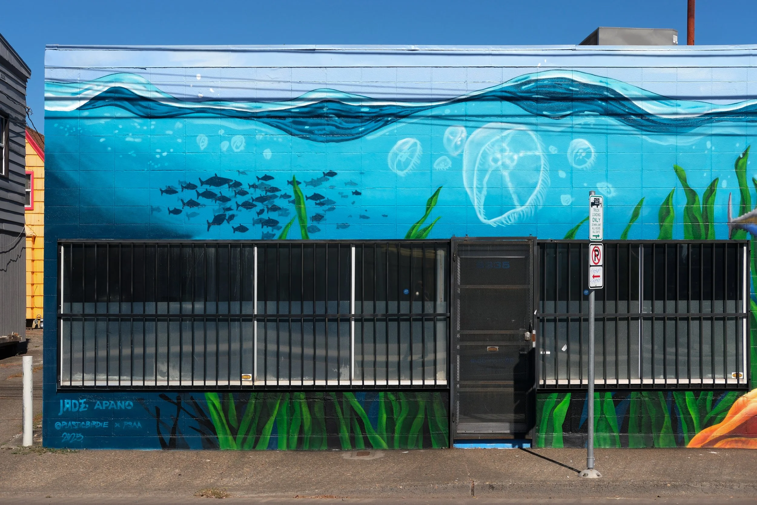 Thank you, PSAA and Jeremy Nichols, for helping make the Jade District a little brighter! We have been talking with the owners of Ocean Blue about doing a mural for years, and now we're making these conversations a reality. Thanks to Venture Portland's Major Impact Award, we are able to highlight this local business while creating interesting and beautiful street art. We hope it will invite more people to walk through the Jade District and visit our local small businesses! – Alisa Kajikawa, APANO Community Development Director, Place Based Programs
