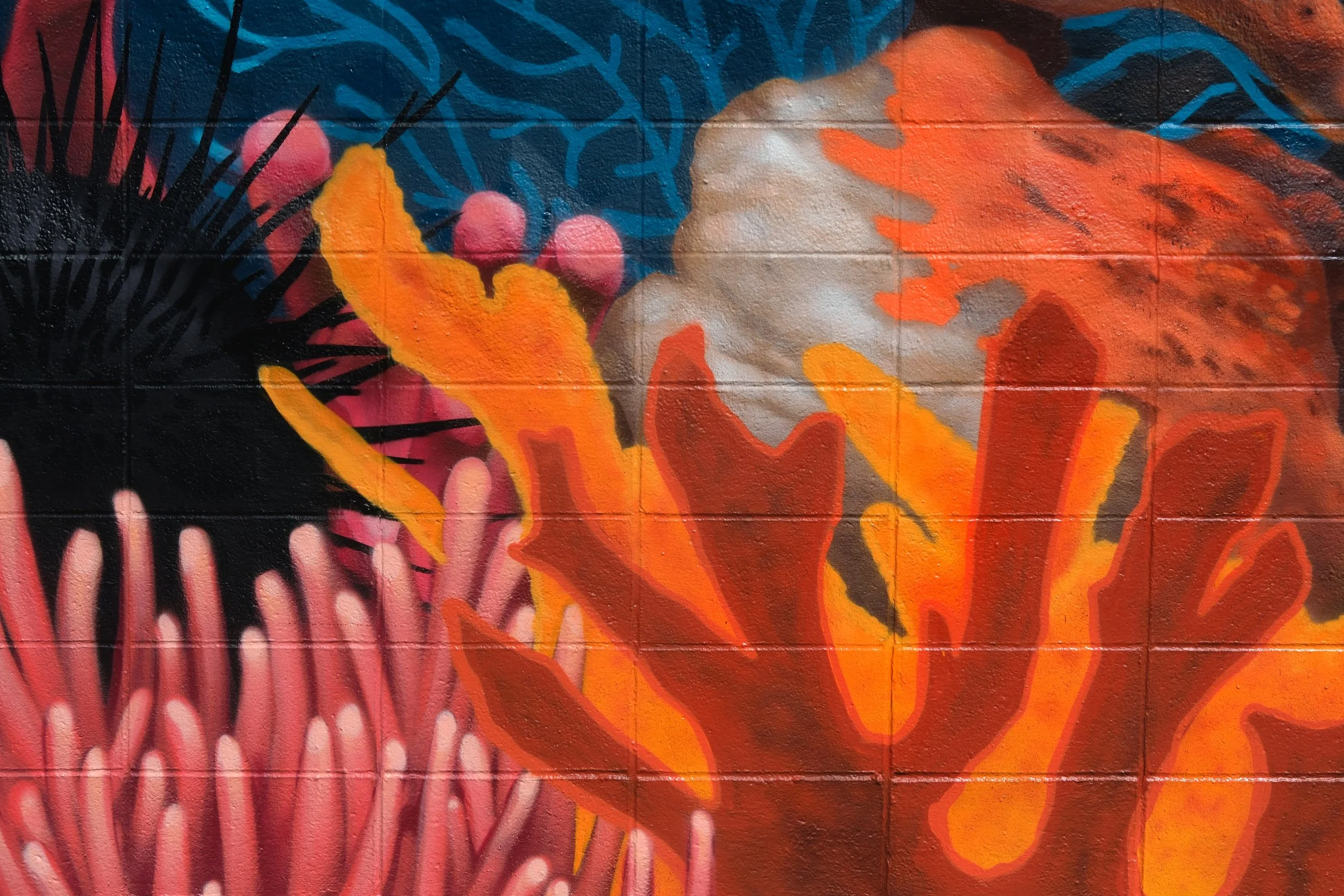 This underwater mural features expertly rendered corals, with blue flowing waves providing a soothing sensory experience. “I wanted to create something bright and in line with the business,” says artist Jeremy Nichols. “I thought a colorful mural depicting an underwater coral reef scene would be an effective approach that would catch the viewer's eye.”
